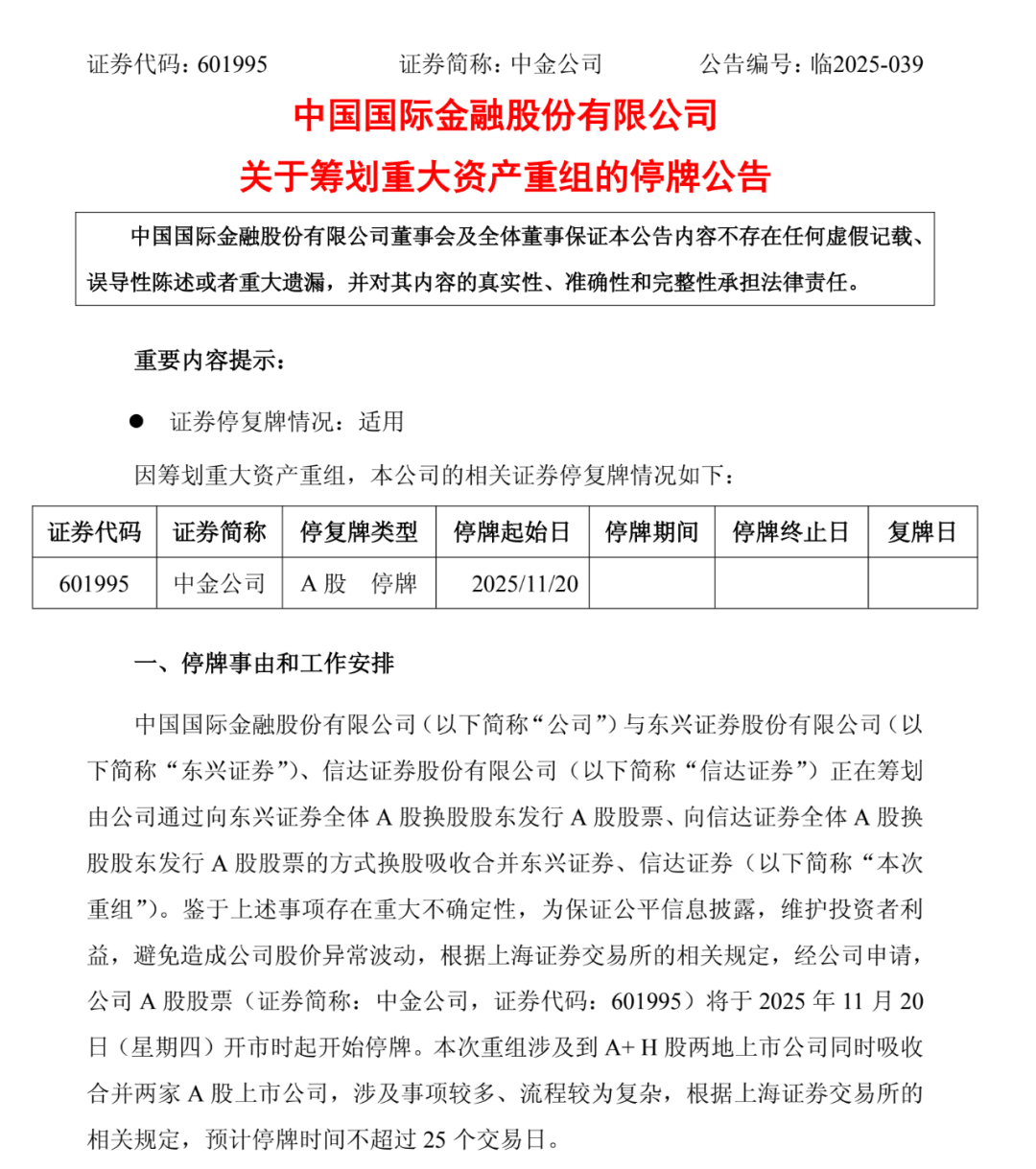 鉴于上述事项存在重大不确定性,为保证公平信息披露,维护投资者利益,避免造成公司股价异常波动,根据上交所相关规定,中金公司、东兴证券、信达证券A股股票均将于2025年11月20日(星期四)开市时起开始停牌。因本次重组涉及到A+H股两地上市公司同时吸收合并两家A股上市公司,涉及事项较多、流程较为复杂,根据相关规定,预计停牌时间不超过25个交易日。
