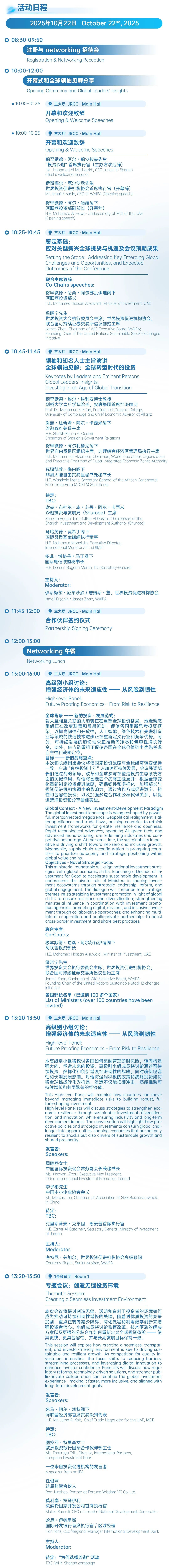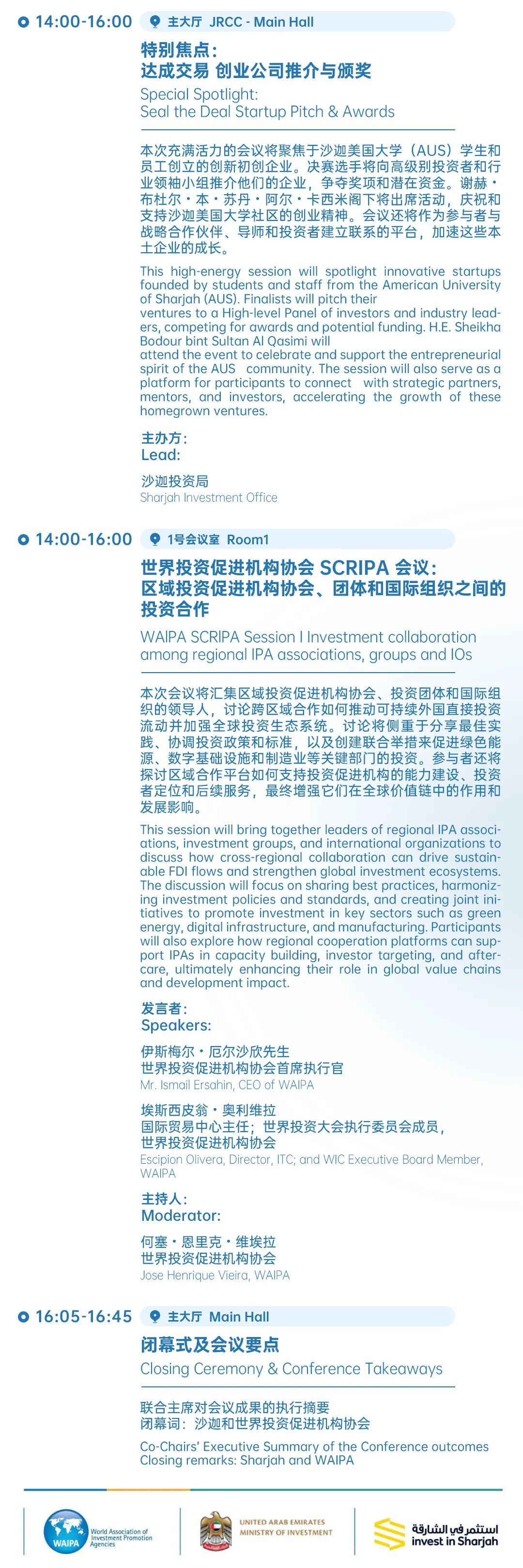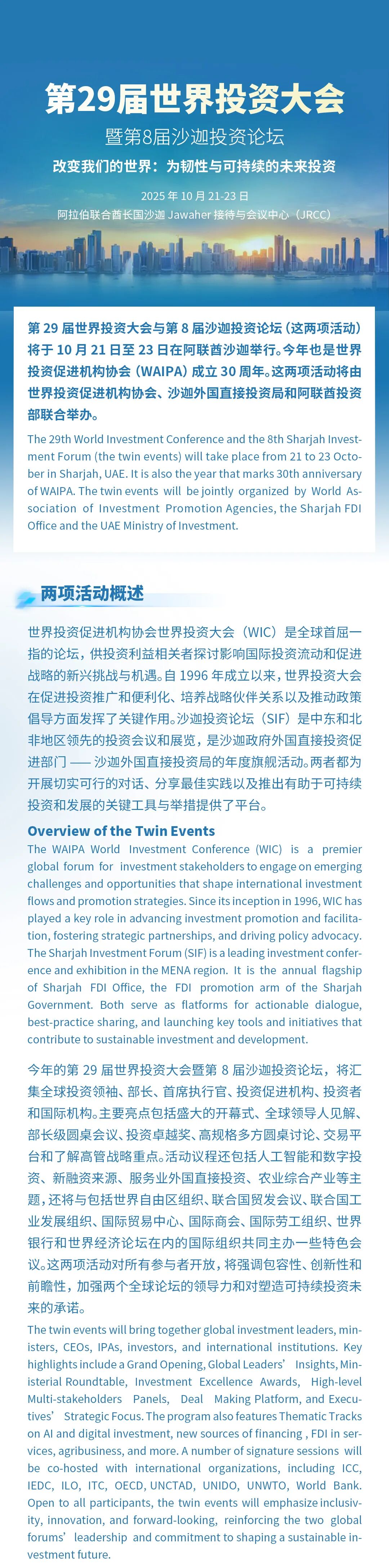 第29届世界投资大会暨第8届沙迦投资论坛将于2025年10月21日至23日在阿联酋沙迦举行。今年也是世界投资促进机构协会(The World Association of Investment Promotion Agencies, WAIPA)成立30周年。这两项活动将由世界投资促进机构协会、沙迦FDI办公室和阿联酋投资部联合举办。