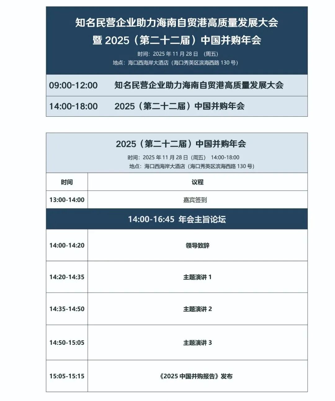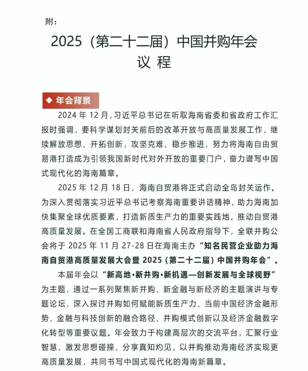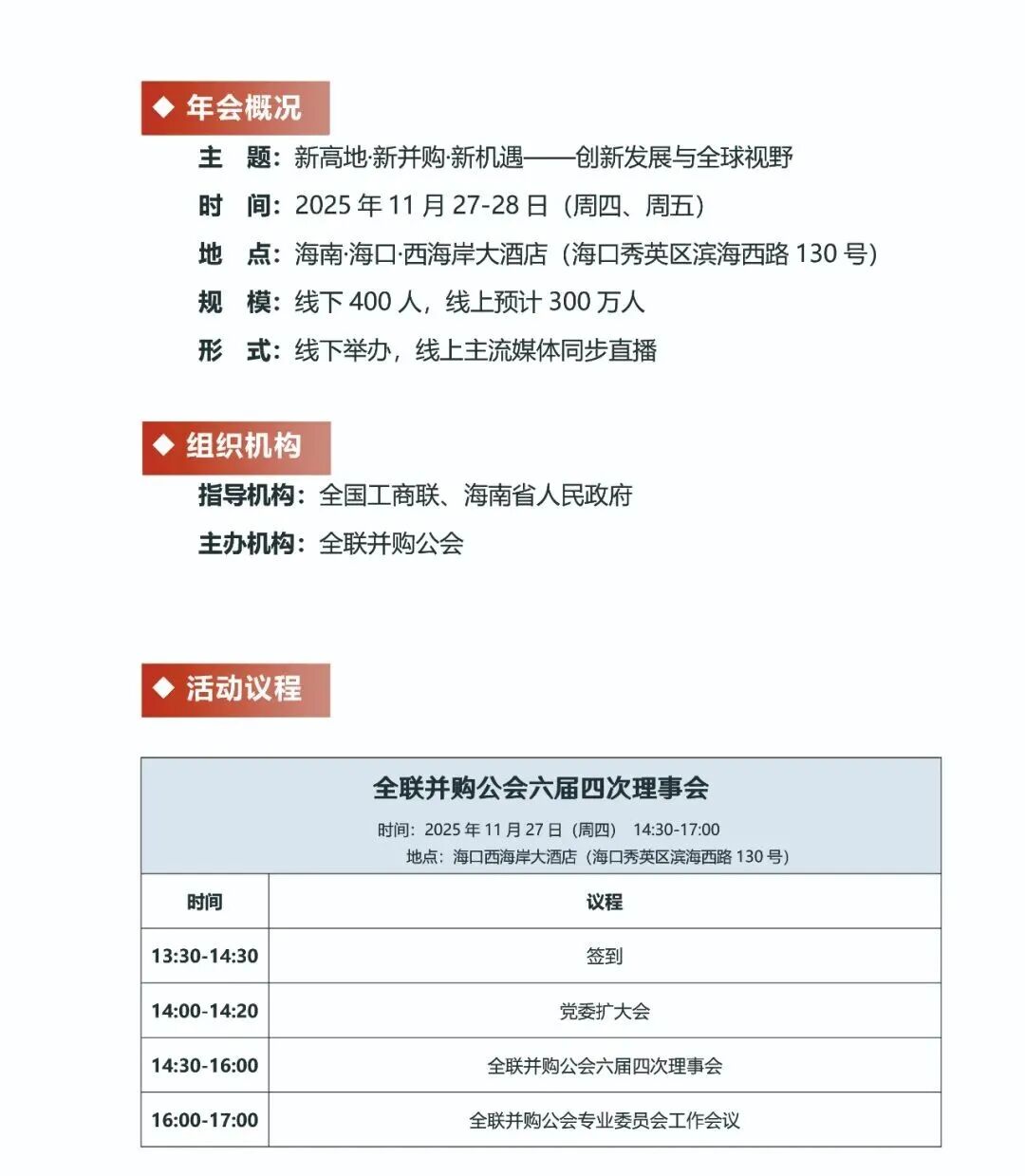 全联并购公会六届四次理事会及2025(第二十二届)中国并购年会定于2025年11月27日-28日在海口召开。第十四届全国政协副主席、中华全国工商业联合会主席高云龙及海南省人民政府领导将出席年会并致辞。会议期间,请理事会参会人员同步参加由全国工商联主办的知名民营企业助力海南自贸港高质量发展大会。现将有关事项通知如下:
