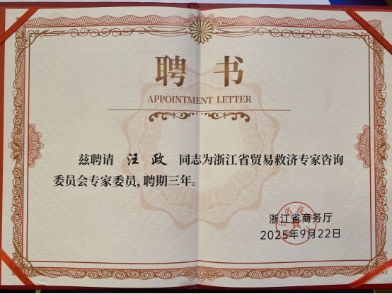 【会领导风采】汪政副会长受聘担任浙江省贸易救济专家咨询委员会专家委员