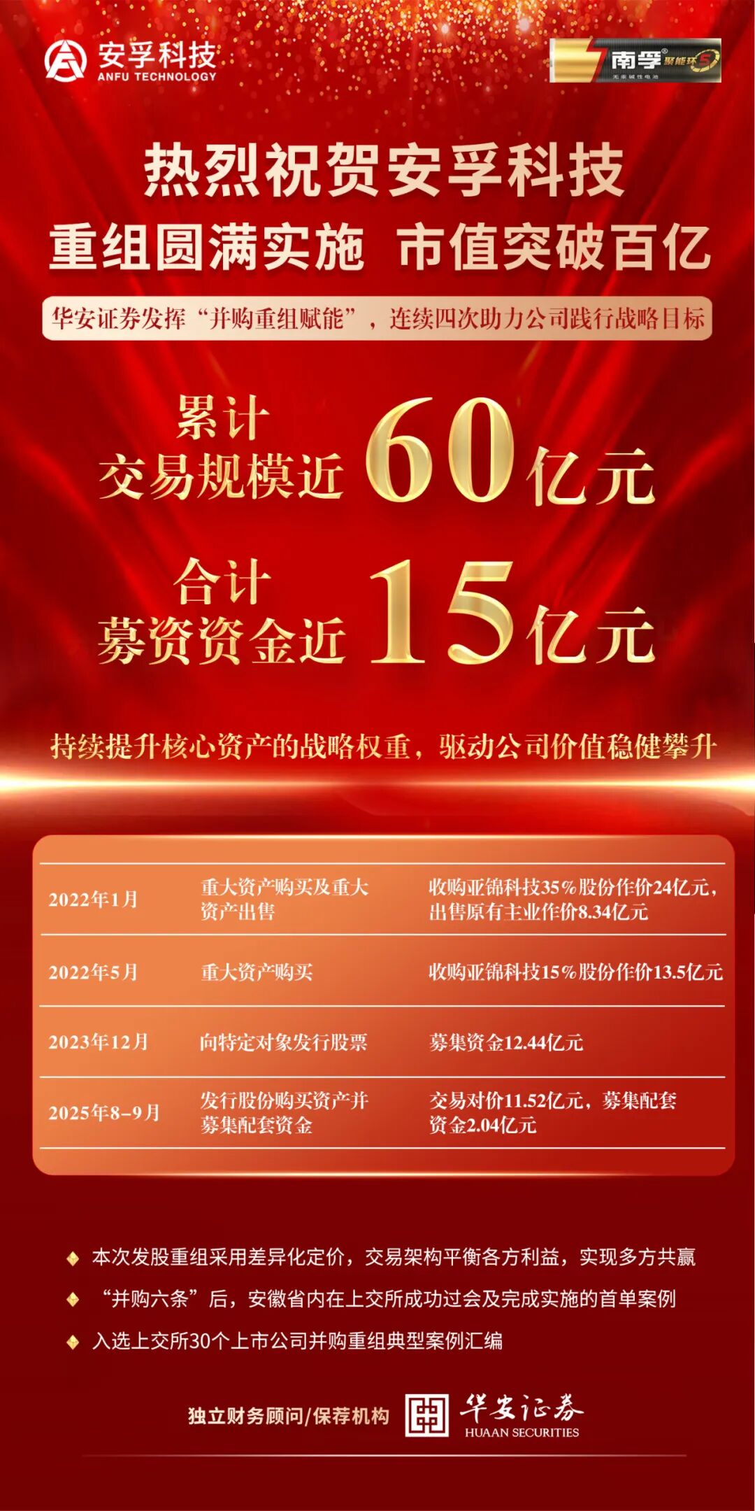 作为资本市场少有的“蛇吞象”、效益优良的资产重组注入案例,安孚科技收购亚锦科技被列为上交所2021年度四大典型案例之一,同时也是其中唯一一家民营企业。2024年11月,“跨界并购:安孚科技收购南孚电池”入选上海证券交易所发布的30个上市公司并购重组典型案例汇编。安孚科技的百亿跃迁,是企业战略远见的体现,亦是华安证券“客户至上、专业致胜”服务理念的生动实践。